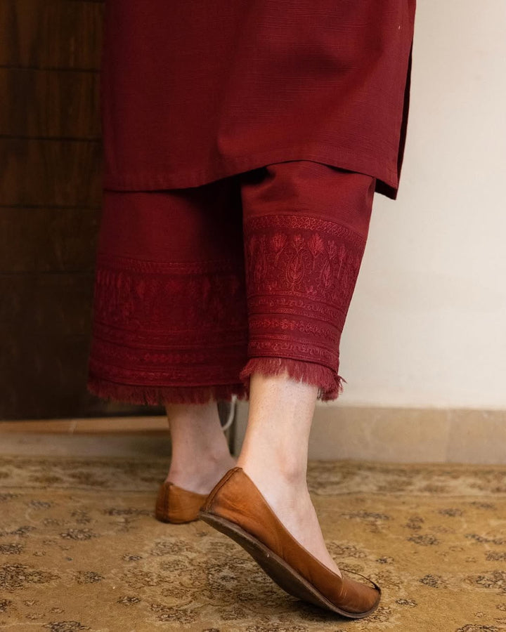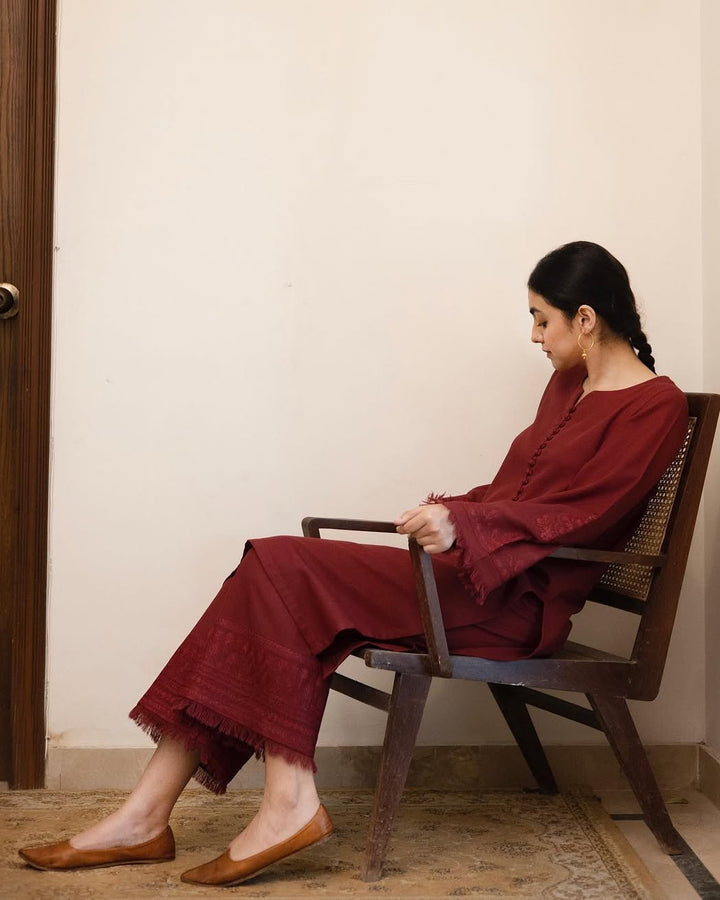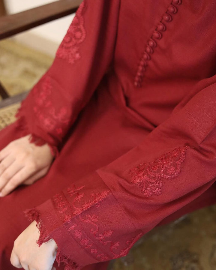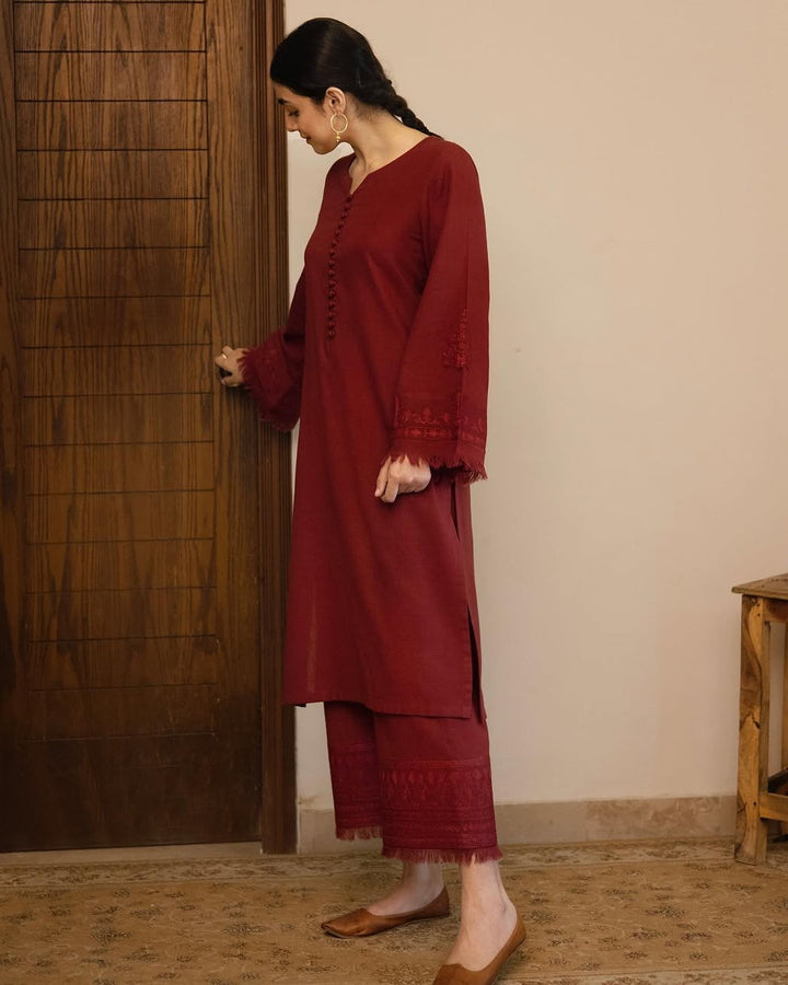 Draped in rich maroon tones with graceful detailing Maroon Mist brings warmth, depth, and timeless allure to your winter style.